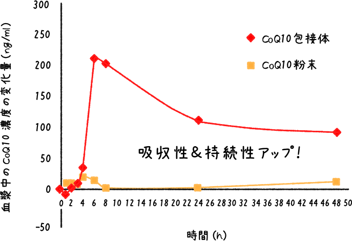 コエンザイムQ10(CoQ10)粉末とCoQ10包接体の吸収性比較